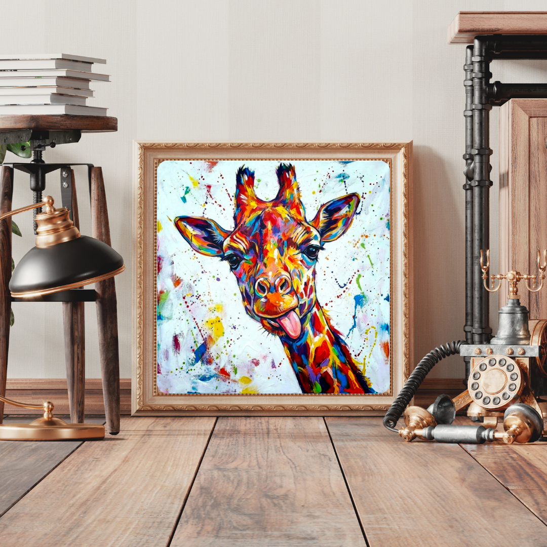- Elevate your walls with our Abstract Multicoloured Giraffe Print. Featuring a bold, rainbow-inspired palette and contemporary geometric strokes, this vibrant wildlife art brings a modern safari vibe to any room. Perfect for eclectic living rooms, modern nurseries, or as a unique gift for animal lovers.