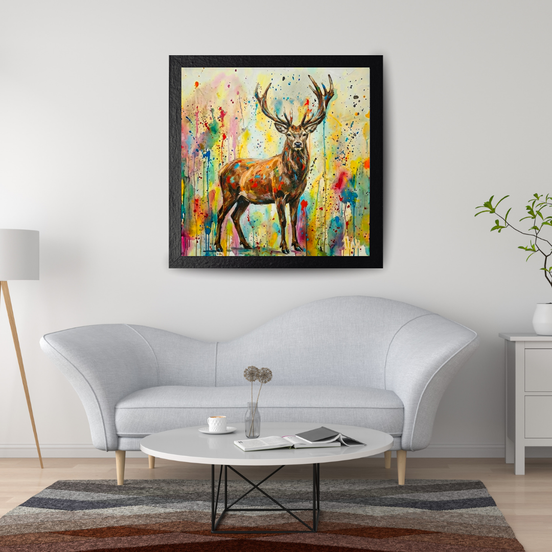 - Elevate your space with this vibrant, abstract stag deer poster print. Featuring a bold geometric design and multicoloured watercolor accents.