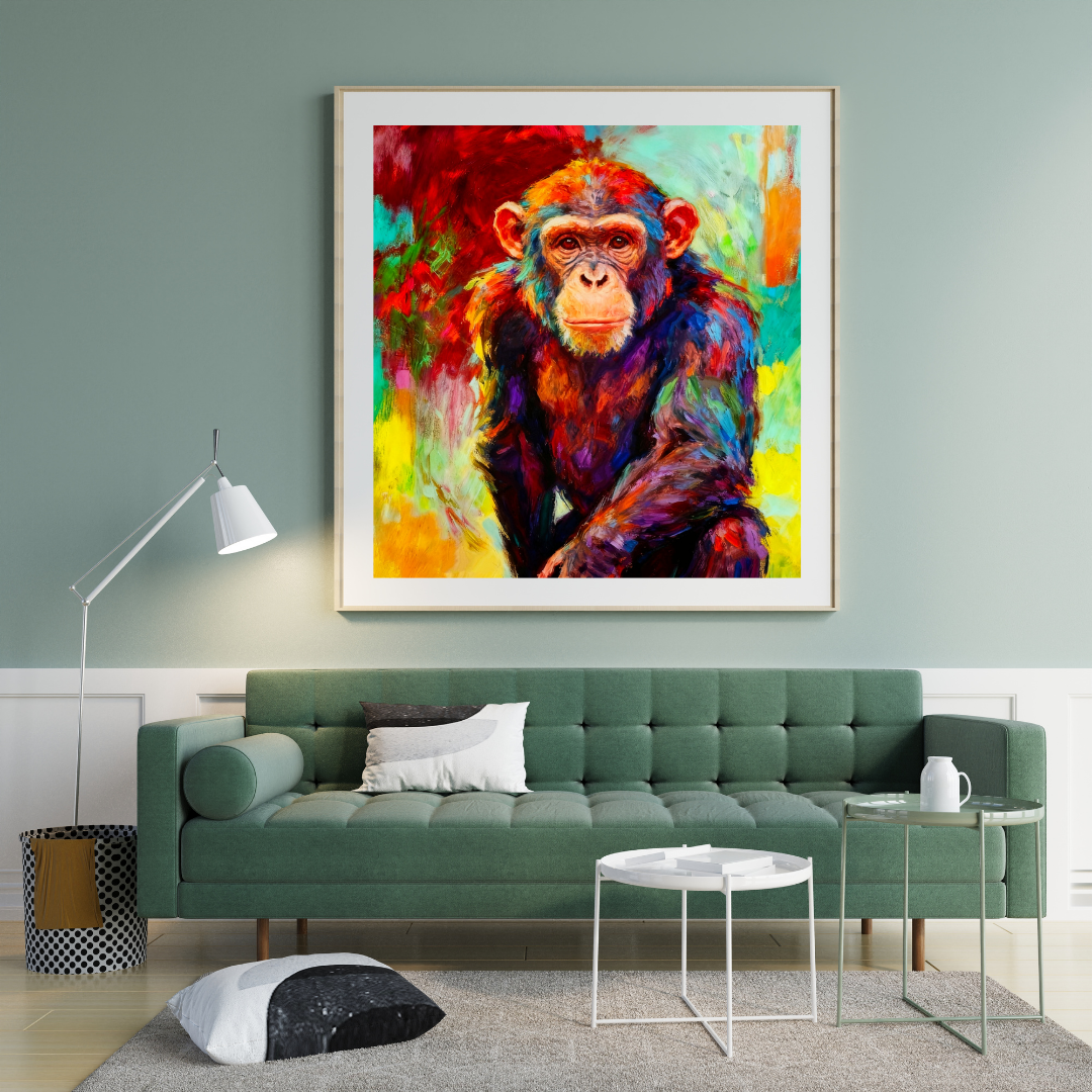 - Make a bold statement with this abstract vibrant chimpanzee wall art. A colorful monkey canvas print perfect for modern living rooms, offices, and unique animal decor lovers.
