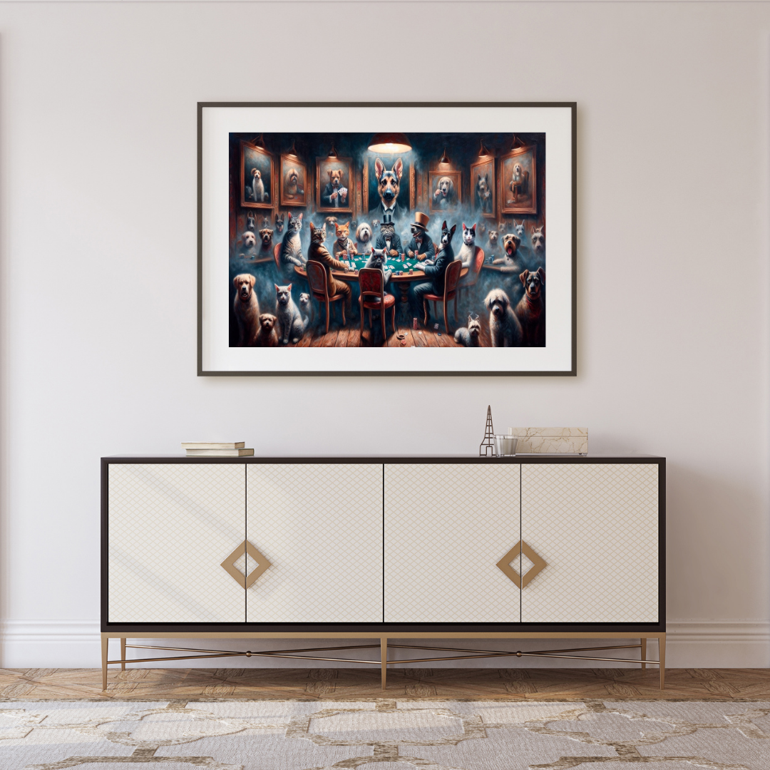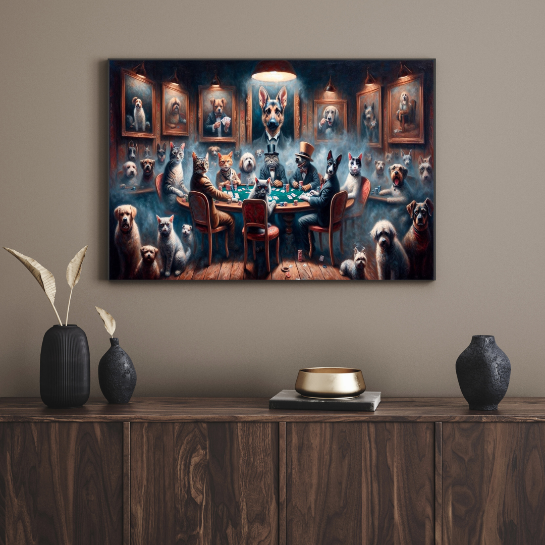 - Brighten up your walls with a dose of humor! Our art print of dogs and cats playing cards is designed to bring a smile to your face. Its whimsical style and vibrant details make it a fantastic addition to any home, office, or man cave.